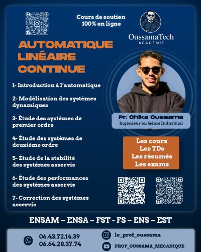 Le module Automatique Linéaire Continue traite la modélisation des systèmes dynamiques, l’étude des systèmes du premier et deuxième ordre, la stabilité, les performances et la correction des systèmes asservis.