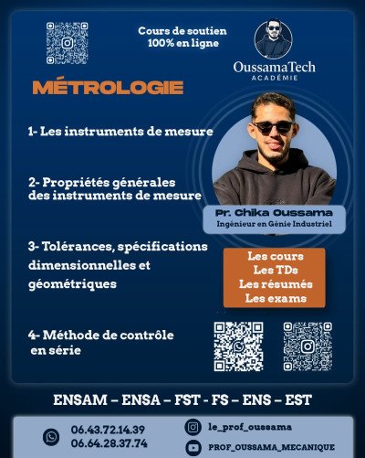 Le module Métrologie couvre les instruments de mesure, leurs propriétés générales, les tolérances et spécifications dimensionnelles et géométriques, ainsi que les méthodes de contrôle en série.